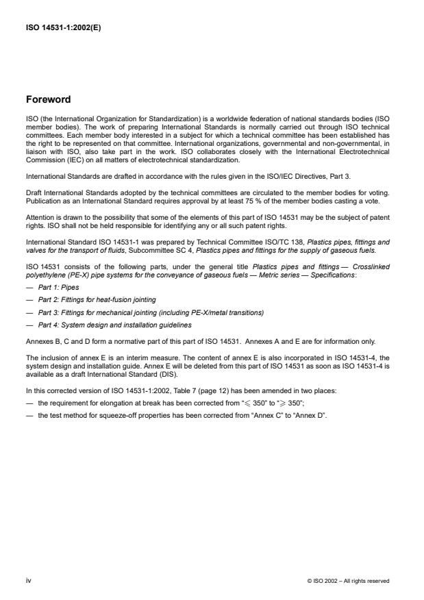 ISO 14531-1:2002 specifies the physical properties and mechanical-performance requirements for crosslinked polyethylene (PE-X) pipes intended for use in the supply of gaseous fuels. In addition, it lays down dimensional requirements and specifies some general material properties (including chemical resistance) together with a classification scheme for PE-X produced in the form of pipe. ISO 14531-1:2002, when used in conjunction with the other parts of ISO 14531, is applicable as the basis for the design, manufacture and installation of PE-X piping systems (PE-X pipes, PE-X fusion fittings and mechanical fittings) for the supply of category D and category E hydrocarbon-based fuels.