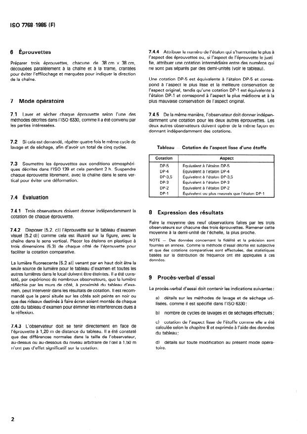 ISO 7768:1985 is a standard published by the International Organization for Standardization (ISO). Its full title is "Textiles — Method for assessing the appearance of durable press fabrics after domestic washing and drying". This standard covers: Specifies a method for assessing the retention of the original smooth appearance, after one or several domestic washing and drying treatments, of those fabrics intended for use in durable press (sometimes referred to as permanent press) products. Fabric specimens are subjected to procedures simulating domestic laundering practices. One of the washing and drying procedures specified in ISO 6330 shall be used.