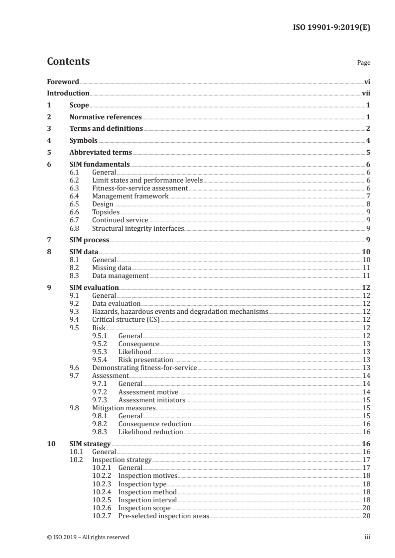 ISO 19901-9 structures its guidance around a lifecycle SIM approach and includes requirements for planning, engineering and execution of integrity tasks. Major technical topics include: