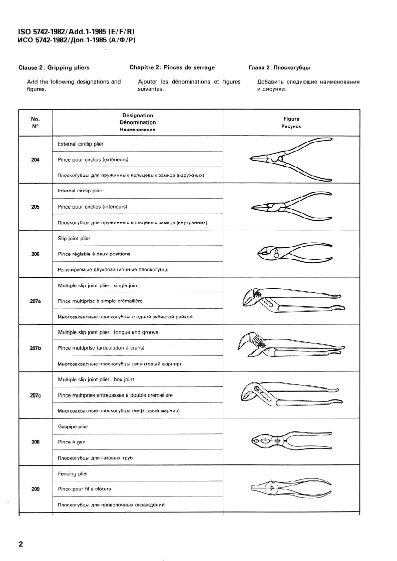 ISO 5742:1982/Add 1:1985 is a standard published by the International Organization for Standardization (ISO). Its full title is "Pliers and nippers — Nomenclature — Addendum 1". This standard covers: Pliers and nippers — Nomenclature — Addendum 1