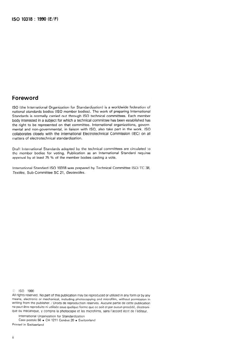 ISO 10318:1990 is a standard published by the International Organization for Standardization (ISO). Its full title is "Geotextiles — Vocabulary". This standard covers: Defines function and product terms applying to geotextiles and geotextile-related products.