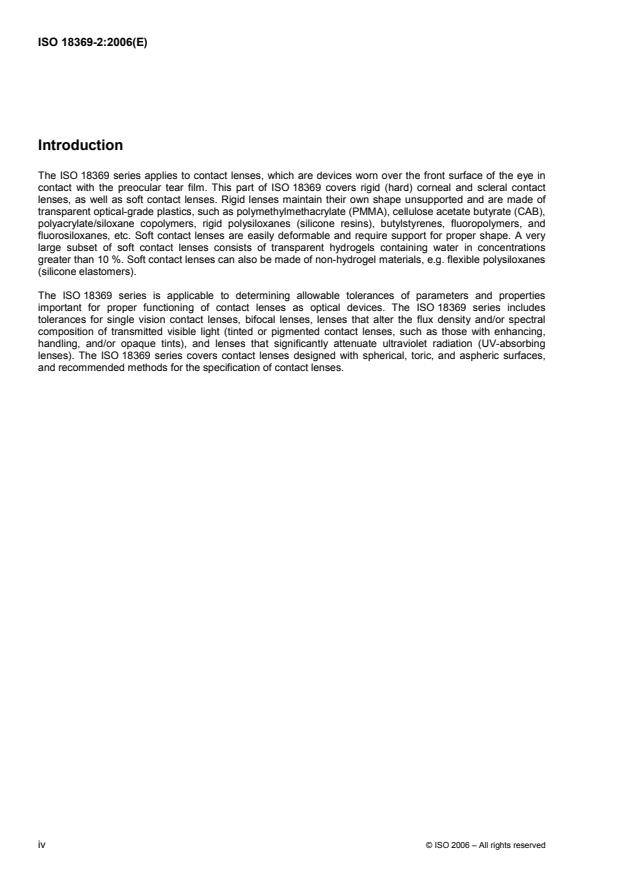 ISO 18369-2:2006 is a standard published by the International Organization for Standardization (ISO). Its full title is "Ophthalmic optics — Contact lenses — Part 2: Tolerances". This standard covers: ISO 18369-2:2006 specifies the tolerance limits of the principal optical and physical parameters of rigid, soft, and rigid scleral contact lenses.