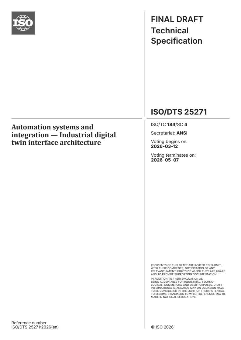 ISO/DTS 25271 - Automation systems and integration — Industrial digital twin interface architecture