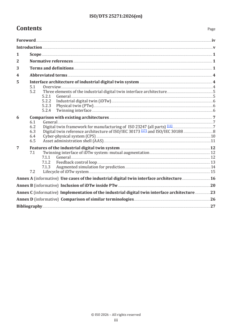ISO/DTS 25271 is a draft published by the International Organization for Standardization (ISO). Its full title is "Automation systems and integration — Industrial digital twin interface architecture". This standard covers: Automation systems and integration – Industrial digital twin interface architecture specifies the architectural components of industrial digital twin systems that are composed of the digital twin, the physical twin and the interface between these two twins. The followings are within the scope of this standard: a) Elements of industrial digital twin systems that represent the unique architecture b) Interactions among the three elements of industrial digital twin systems c) Characteristics of industrial digital twin systems which are different from similar concepts or technologies d) Typical use cases of the three element architecture are examined. The following are outside the scope of this standard a) Applications of industrial digital twin systems