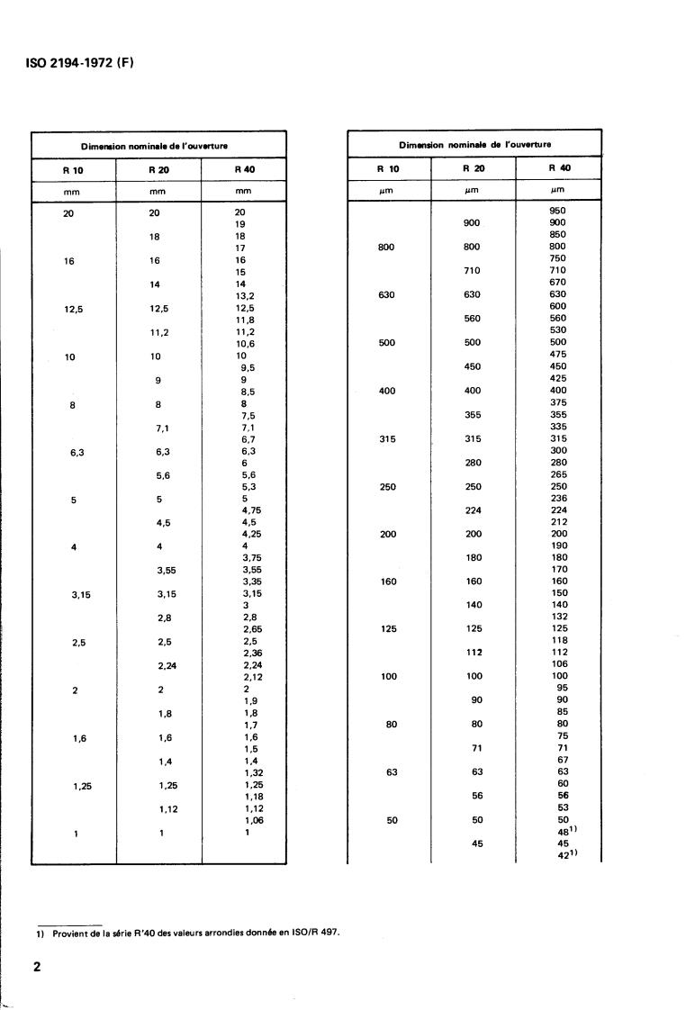 diamètres des fils des toiles et les tolerances à ce sujet seront la deuxième colonne (R 20) et, si nécessaire,