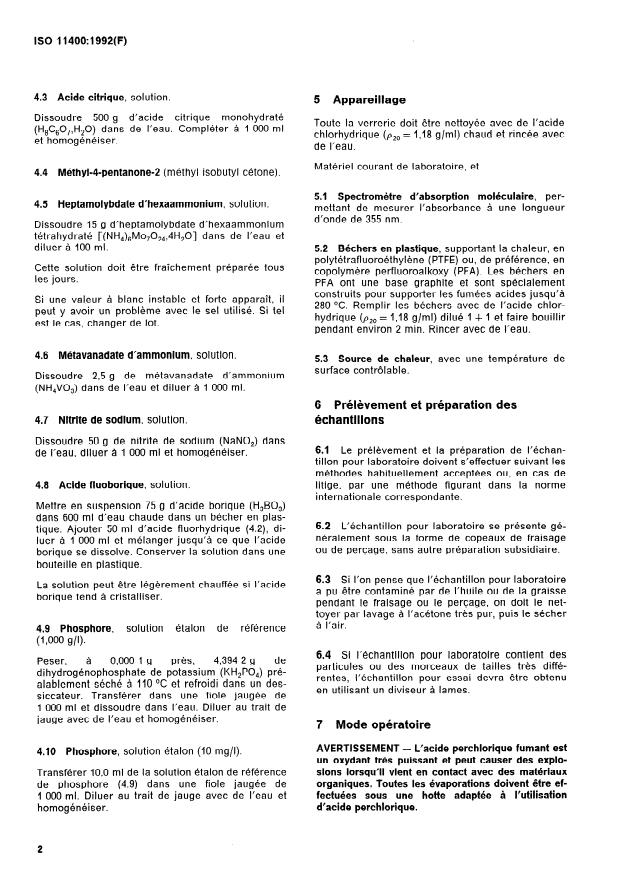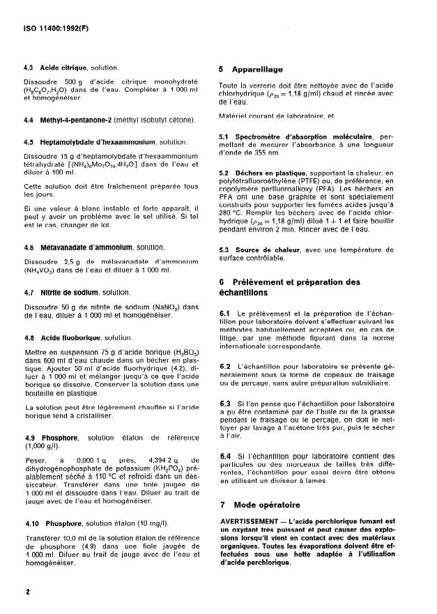 ISO 11400:1992 is a standard published by the International Organization for Standardization (ISO). Its full title is "Nickel, ferronickel and nickel alloys — Determination of phosphorus content — Phosphovanadomolybdate molecular absorption spectrometric method". This standard covers: Phosphorus content can be determined in the range of 0,000 5 % (m/m) to 0,05 % (m/m). As, Cr, Hf, Nb, Si, Ta, Ti, W interfere, but the interferences can be avoided. The principle is dissolution of a test portion in a mixture of nitric and hydrochloric acids, fuming with perchloric acid, removal of chromium, complexation of silicon, conversion of phosphorus to phosphovanadomolybdic acid, extraction of this compound.