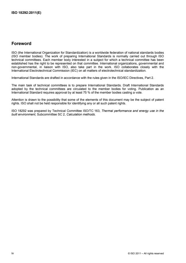 ISO 18292:2011 is a standard published by the International Organization for Standardization (ISO). Its full title is "Energy performance of fenestration systems for residential buildings - Calculation procedure". This standard covers: ISO 18292:2011 specifies a procedure for calculation of the energy performance of fenestration systems used in residential buildings, for rating of fenestration systems, doors and skylights, including the effects of frame, sash, glazing, and shading components. ISO 18292:2011 specifies procedures for the calculation of the heating and cooling energy use in residential buildings, internal and external climatic conditions, and relevant building characteristics. These procedures can accommodate all climatic conditions and installation details. It is the responsibility of the appropriate regulatory authority to identify the clauses of ISO 18292:2011 to be applied in their area of jurisdiction and the climatic data and reference building specification(s) to be used.