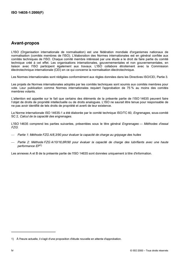 ISO 14635-1:2000 is a standard published by the International Organization for Standardization (ISO). Its full title is "Gears — FZG test procedures — Part 1: FZG test method A/8,3/90 for relative scuffing load-carrying capacity of oils". This standard covers: This part of ISO 14635 specifies a test method based on an FZG2_ four-square test machine to determine the relative load-carrying capacity of lubricating oils defined by the gear-surface damage known as scuffing. High surface temperatures due to high surface pressures and sliding velocities can initiate the breakdown of the lubricant films. This test method can be used to assess such lubricant breakdown under defined conditions of temperature, high sliding velocity and stepwise increased load. NOTE This method is technically equivalent to ASTM D 5182-97, DIN 51354-1 and DIN 51354-2, IP 334/90 and CEC L-07-A-95.
