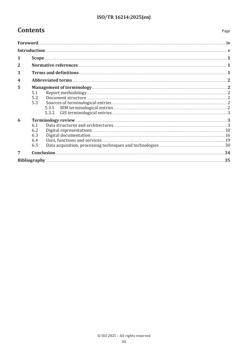 ISO/TR 16214:2025 is a technical report published by the International Organization for Standardization (ISO). Its full title is "Review of geospatial and building information modelling (BIM) terminological entries". This standard covers: This document provides an overview of terminological entries relating to building information modelling (BIM) as well as those relating to geographic information or geomatics. This document identifies terminological entries which are identical, equivalent (i.e. synonyms), homonymous, and entries which are unique to their respective domains. This document does not provide recommendations to resolve terminology homonyms.