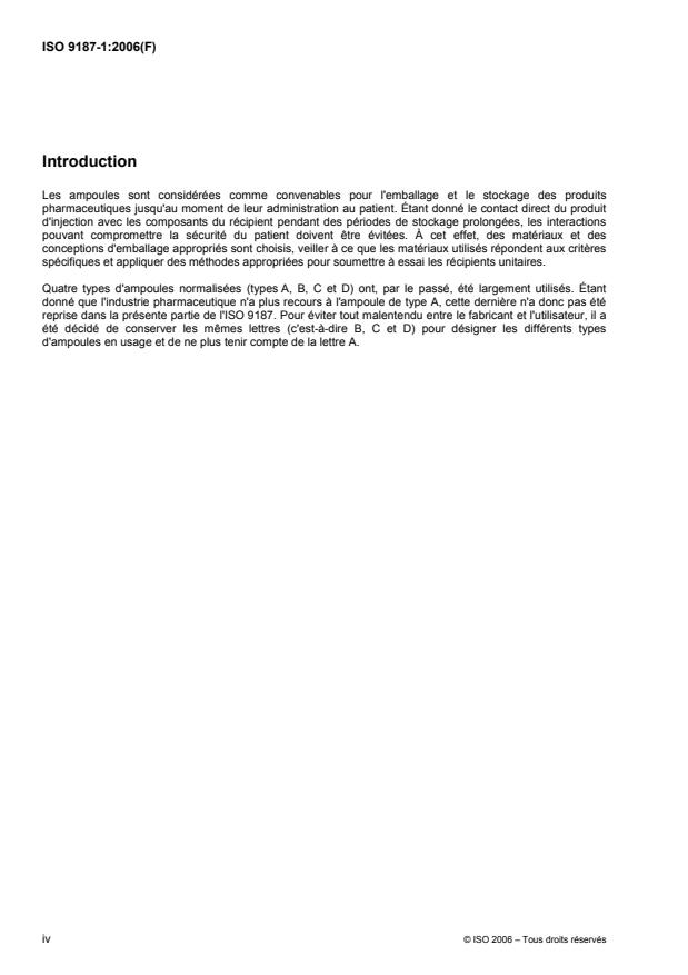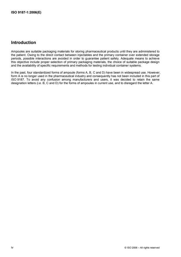 ISO 9187-1:2006 specifies materials, dimensions, capacities, performance and packaging requirements for three forms of glass ampoule (forms B, C and D) for injectable pharmaceutical products. It is applicable to ampoules with and without a colour break-ring. The provision of ampoules with a colour break-ring, and the choice of colour of the break-ring, is subject to agreement between the manufacturer and user. Ampoules complying with ISO 9187-1:2006 are intended for single use only.