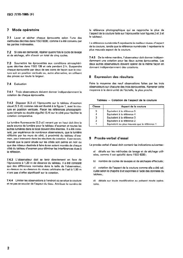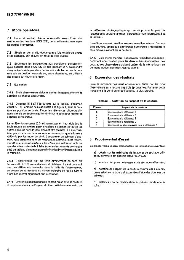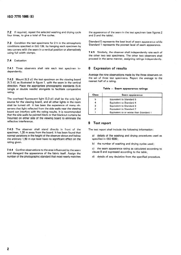 ISO 7770:1985 is a standard published by the International Organization for Standardization (ISO). Its full title is "Textiles — Method for assessing the appearance of seams in durable press products after domestic washing and drying". This standard covers: Seamed fabric specimens are subjected to procedures simulating domestic laundering practices. One of the washing and drying procedures specified in ISO 6330 shall be used. The specimens are compared visually with photographic standards under defined illumination.