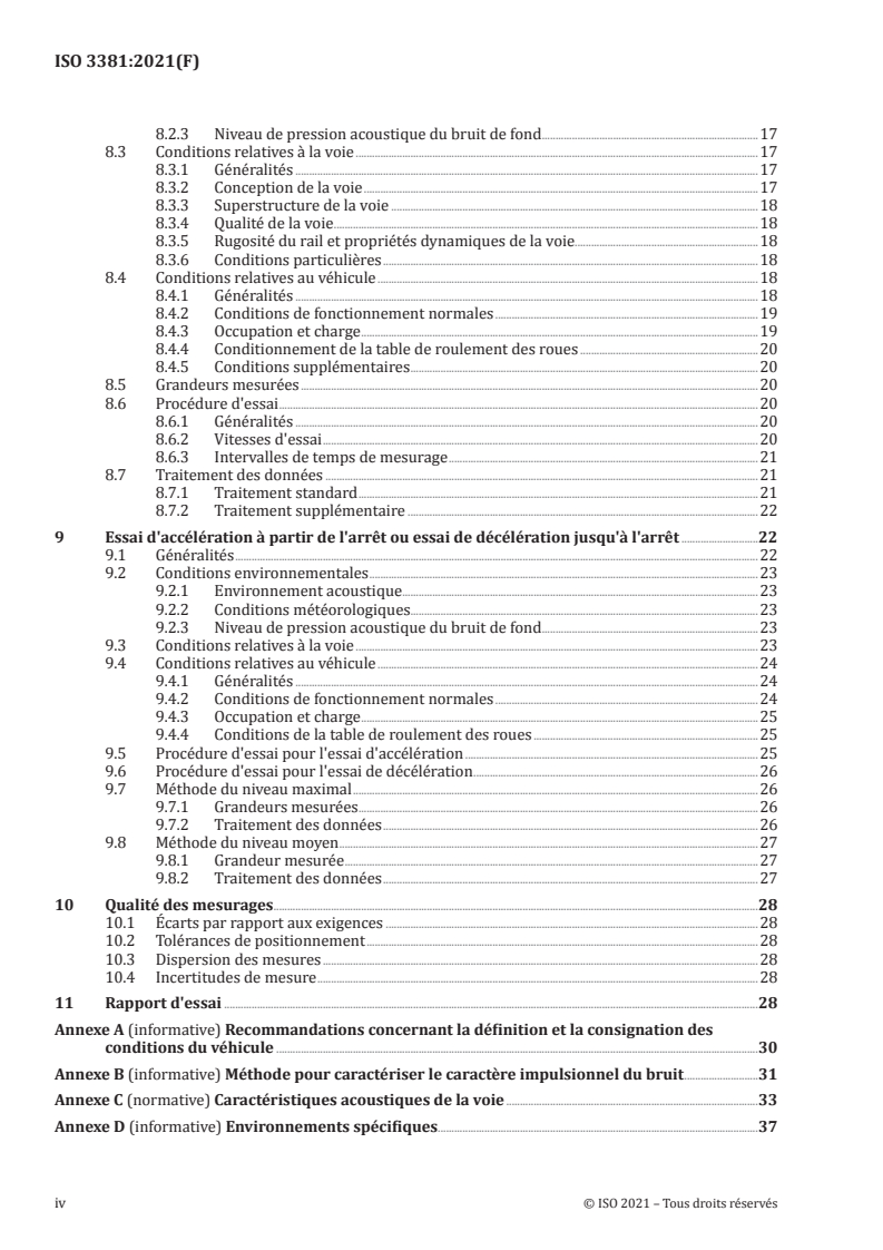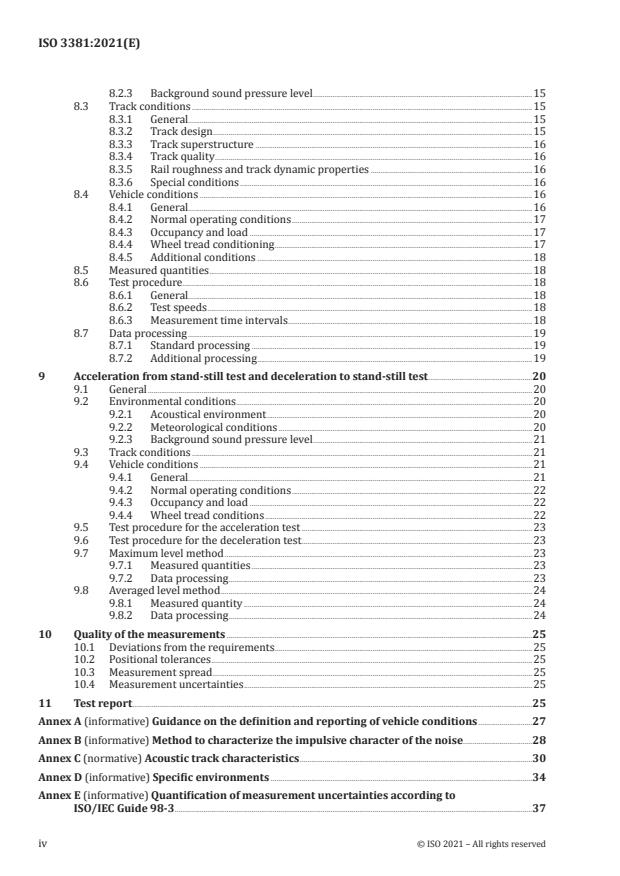 ISO 3381:2021 is a standard published by the International Organization for Standardization (ISO). Its full title is "Railway applications — Acoustics — Noise measurement inside railbound vehicles". This standard covers: This document specifies the measurement method and conditions to obtain reproducible noise levels on-board all kinds of vehicles operating on rails or other types of fixed track, hereinafter conventionally called “unit”, except for track maintenance vehicles in working modes. This document is applicable to type testing. It does not include all the instructions to carry out monitoring testing or evaluation of noise exposure of passengers or drivers over a whole journey. This document is not applicable to guided buses. It provides measurement procedures for vehicle interior noise (in general, a vehicle type test is carried out using only a selected subset of these tests): — when the vehicle is moving at constant speed; — when the vehicle is stationary; — when the vehicle is accelerating or decelerating; — in the driver's cab when an external warning horn is sounding (specifically required for European Union regulation application) It does not provide measurement procedures for: — audibility or intelligibility of any audible signals; — assessment of warning devices other than warning horns. The assessment of noise exposure of train crew due to operational conditions is not in the scope of this document. The results can be used, for example: — to characterise the noise inside these units; — to compare the internal noise of various units on a particular track section; — to collect basic source data for units. The test procedures specified in this document are of engineering grade (grade 2), the preferred grade for noise declaration purposes as defined in ISO 12001. If test conditions are relaxed, for example as they are for monitoring of in-service trains, then the results are no longer of engineering grade. The procedures specified for accelerating and decelerating tests are of survey grade (grade 3).