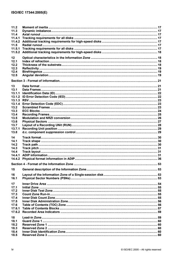 ISO/IEC 17344:2005 is a standard published by the International Organization for Standardization (ISO). Its full title is "Information technology — Data interchange on 120 mm and 80 mm optical disk using +R format — Capacity: 4,7 and 1,46 Gbytes per side (recording speed up to 8X)". This standard covers: ISO/IEC 17344:2005 specifies the mechanical, physical and optical characteristics of 120 mm recordable optical disks with capacities of 4,7 GB and 9,4 GB. It specifies the quality of the recorded and unrecorded signals, the format of the data and the recording method, thereby allowing for information interchange by means of such disks. The data can be written once and read many times using a non-reversible method. These disks are identified as +R. The +R system also allows 80 mm disks with capacities of 1,46 GB and 2,92 GB. These disks shall have the same characteristics as the 120 mm disks, except for some parameters related to the smaller dimensions. All parameters unique for the 80 mm disks are specified in Annex A. ISO/IEC 17344:2005 specifies: two related but different Types of this disk; the conditions for conformance; the environments in which the disk is to be tested, operated and stored; the mechanical, physical and dimensional characteristics of the disk, so as to provide mechanical interchange between data processing systems; the format of the information on the disk, including the physical disposition of the tracks and sectors, the error correcting codes and the coding method; and the characteristics of the signals recorded on the disk, thus enabling data processing systems to read the data from the disk. ISO/IEC 17344:2005 provides for the interchange of disks between optical disk drives. Together with a standard for volume and file structure, it provides for full data interchange between data processing systems.