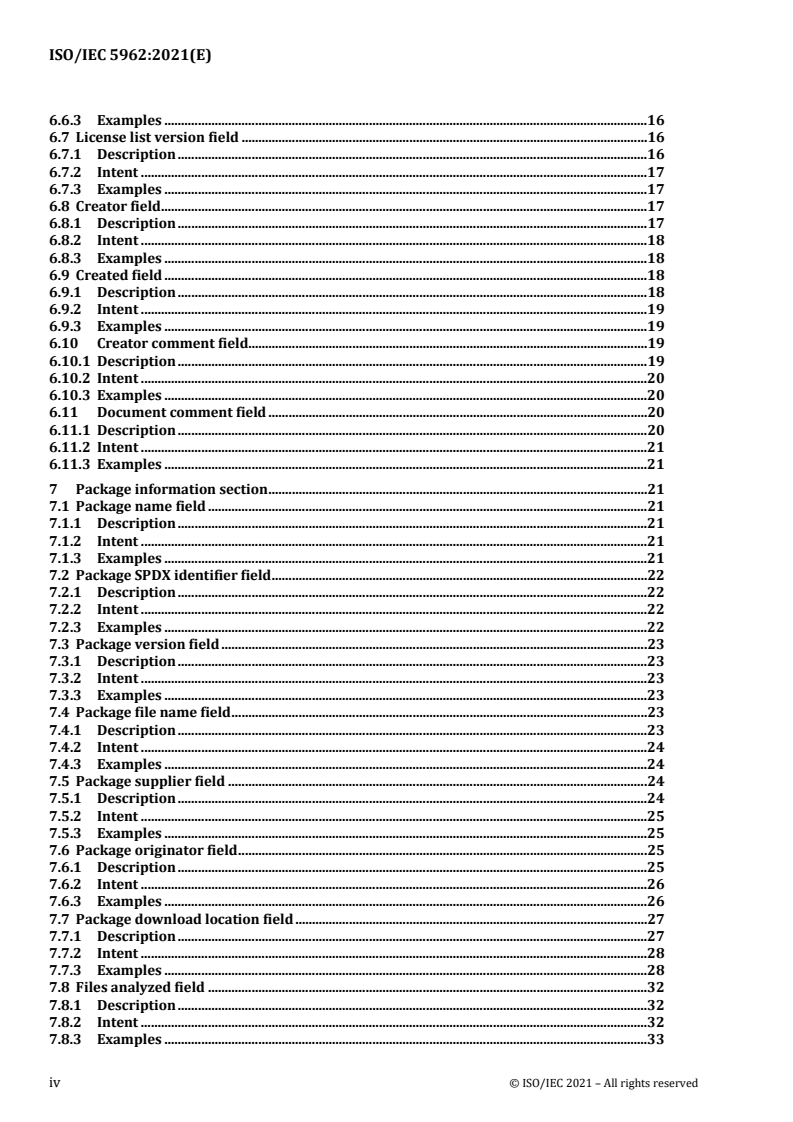 ISO/IEC 5962:2021 is a standard published by the International Organization for Standardization (ISO). Its full title is "Information technology — SPDX® Specification V2.2.1". This standard covers: This Software Package Data Exchange® (SPDX®) specification defines a standard data format for communicating the component and metadata information associated with software packages. An SPDX document can be associated with a set of software packages, files or snippets and contains information about the software in the SPDX format described in this specification.