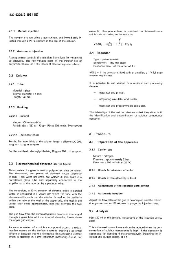 ISO 6326-2:1981 is a standard published by the International Organization for Standardization (ISO). Its full title is "Gas analysis - Determination of sulphur compounds in natural gas - Part 2: Gas chromatographic method using an electrochemical detector for the determination of odoriferous sulphur compounds". This standard covers: Specifies a method for the qualitative and quantitative analysis of sulphur compounds which may occur naturally in natural gas and remain as traces after treatment, or they have been injected deliberately to allow subsequent olfactory detection. The method is applicable to: hydrogen sulphide, methanethiol and homologues up to butanethiols, and thiacyclopentane. It is not applicable for the determination of carbonyl sulphide.
