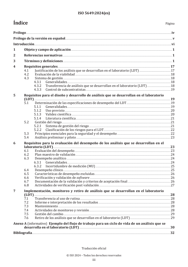 ISO 5649:2024 is a standard published by the International Organization for Standardization (ISO). Its full title is "Medical laboratories - Concepts and specifications for the design, development, implementation and use of laboratory-developed tests". This standard covers: This document establishes requirements for assuring quality, safety, performance and documentation of laboratory-developed tests (LDTs) as per their intended use for the diagnosis, prognosis, monitoring, prevention or treatment of medical conditions. It outlines the general principles and assessment criteria by which an LDT shall be designed, developed, characterized, manufactured, validated (analytically and clinically) and monitored for internal use by medical laboratories. The scope includes regulatory authority approved IVD medical devices that are used in a manner differing from approved labelling or instructions for use for that device (e.g. use of a sample type not included in the intended use, use of instruments or reagents not included in the labelling). While this document follows a current best practice and state-of-the art approach, it does not provide specific details on how to achieve these requirements within specific disciplines of the medical laboratory nor specific technology platforms. This document does not specify requirements for examination procedures developed by research or academic laboratories developing and using testing systems for non-IVD purposes. However, the concepts presented in this document can also be useful for these laboratories. This document does not apply to the design, development and industrial production of commercially used IVD medical devices.