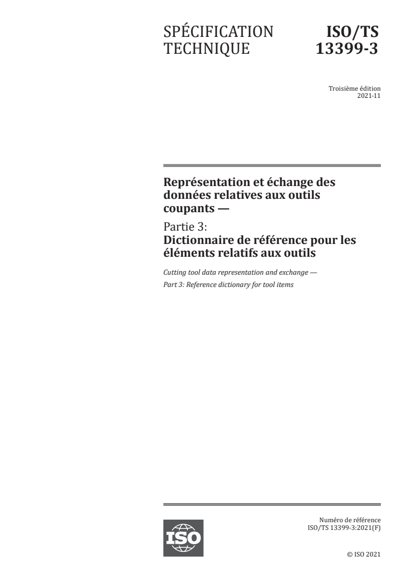 ISO/TS 13399-3:2021 - Représentation et échange des données relatives aux outils coupants — Partie 3: Dictionnaire de référence pour les éléments relatifs aux outils Released:11/29/2021