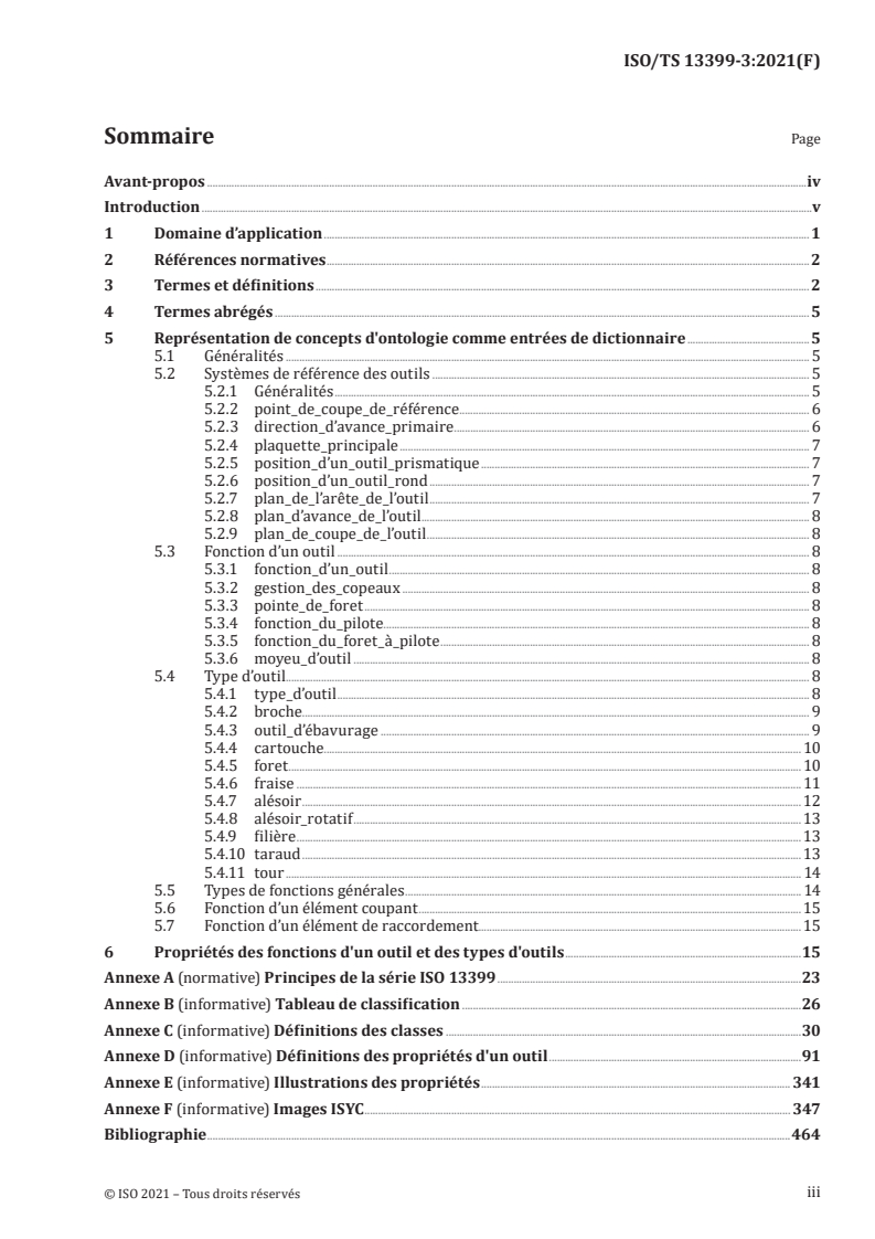 Le présent document spécifie un dictionnaire de référence pour les outils, accompagnés de leurs propriétés descriptives et leurs domaines de valeurs. Le présent document spécifie un dictionnaire de référence comportant: — des définitions et identifications des classes d'outils et leurs caractéristiques, avec un schéma de classification associé; — des définitions et identifications de types d'éléments de données qui représentent les propriétés des outils et leurs caractéristiques; — des définitions et identifications de domaines de valeurs pour décrire les types d'éléments de données mentionnés ci-dessus. Les éléments suivants entrent dans le domaine d'application du présent document: — les données standards représentant les différentes classes d'outils et caractéristiques d'outils; — les données standards représentant les différentes propriétés d'outils et caractéristiques d'outils; — les données standards représentant les domaines de valeurs utilisés pour les propriétés des outils et caractéristiques d'outils; — la définition des opérations de coupe; — les définitions de systèmes de référence des outils et leurs propriétés; — une méthode d’implémentation par laquelle les données normalisées définies dans le présent document peuvent être échangées. NOTE 1 La méthode d’implémentation par laquelle les données normalisées définies dans le présent document peuvent être échangées est spécifiée dans l'ISO 10303-21. Les éléments suivants n'entrent pas dans le domaine d'application du présent document: — les connaissances spécialisées et l'expertise en matière de conception et utilisation des outils coupants; — les règles permettant de déterminer quelles informations il convient de communiquer; — les applications où les données normalisées peuvent être stockées ou référencées; — les méthodes d’implémentation autres que celle définie dans le présent document par laquelle les données normalisées peuvent être échangées ou référencées; — le modèle d'information pour les outils coupants; — les définitions des classes et propriétés relatives aux éléments coupants; — les définitions des classes et propriétés relatives aux attachements; — les définitions des classes et propriétés relatives aux assemblages; — les définitions des classes et propriétés relatives aux systèmes de connexion; — les définitions des classes et propriétés relatives aux systèmes de référence. NOTE 2 Le modèle d'information pour les outils coupants est défini dans l’ISO 13399-1. NOTE 3 Les définitions des classes et propriétés relatives aux outils, attachements, assemblages et éléments auxiliaires sont fournies dans l'ISO/TS 13399‑2, l'ISO/TS 13399‑4, et l'ISO/TS 13399‑5, respectivement. NOTE 4 Les définitions des classes et propriétés relatives aux systèmes de connexion et aux systèmes de référence sont fournies dans l'ISO/TS 13399-50.