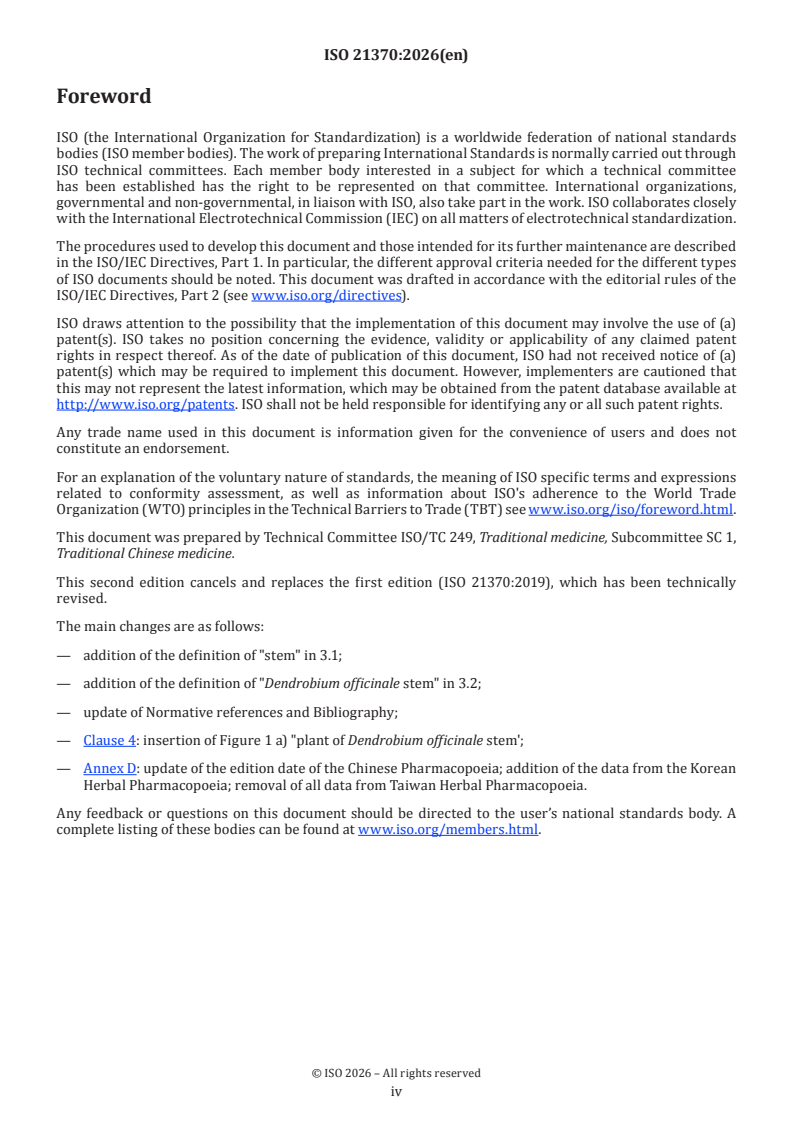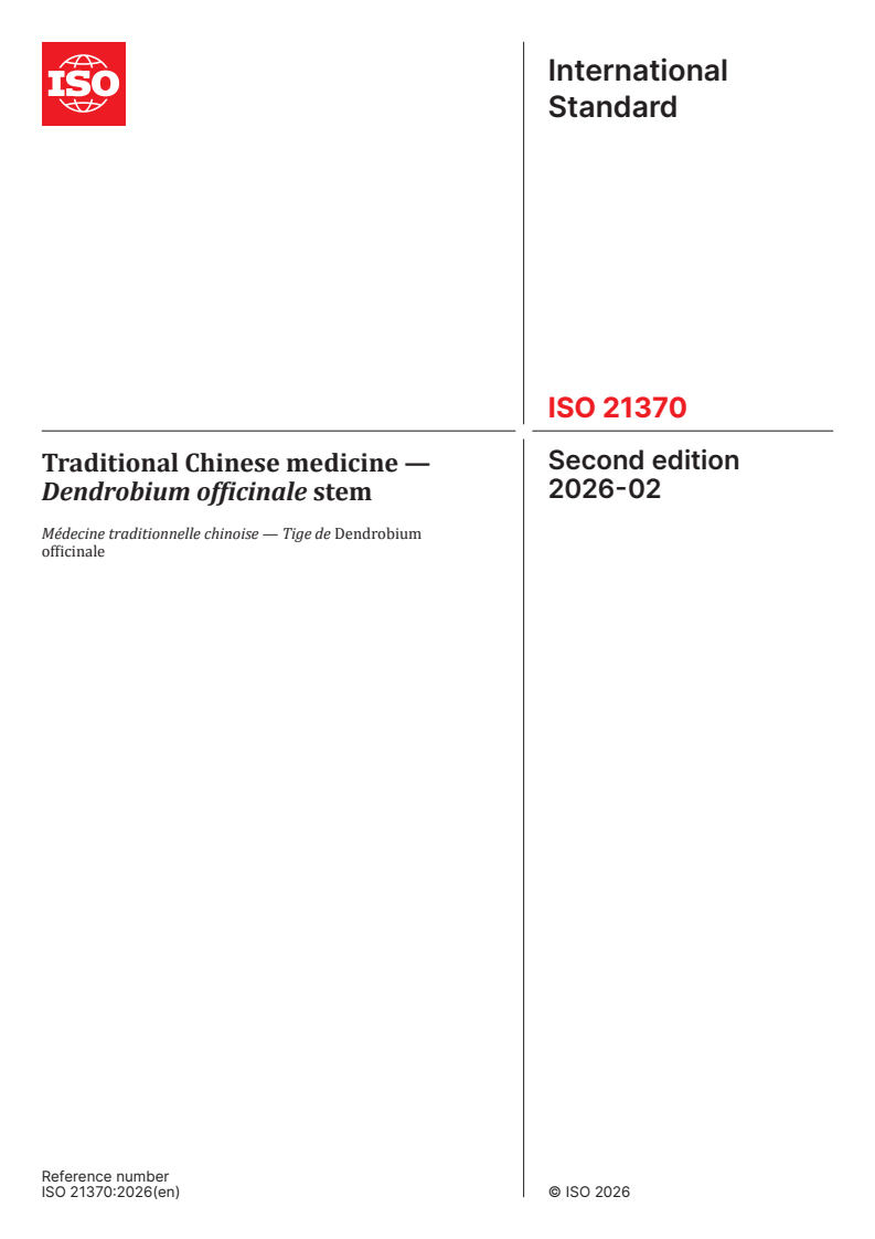 ISO 21370:2026 is a standard published by the International Organization for Standardization (ISO). Its full title is "Traditional Chinese medicine — Dendrobium officinale stem". This standard covers: This document specifies minimum requirements and test methods for Dendrobium officinale stem that is derived from cultivated Dendrobium officinale Kimura et Migo. It is applicable to Dendrobium officinale stem that is sold and used as Chinese materia medica (whole medicinal materials) and decoction pieces derived from this plant.