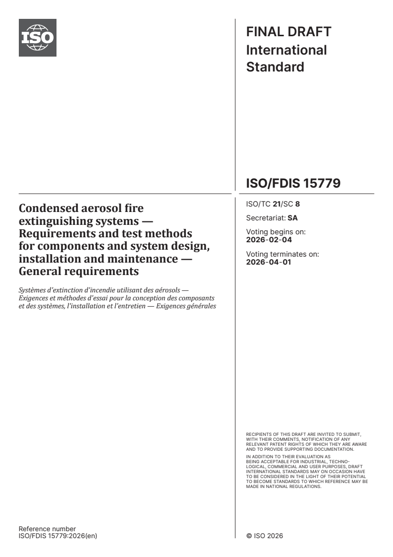 ISO/FDIS 15779 - Condensed aerosol fire extinguishing systems — Requirements and test methods for components and system design, installation and maintenance — General requirements Released:21. 01. 2026