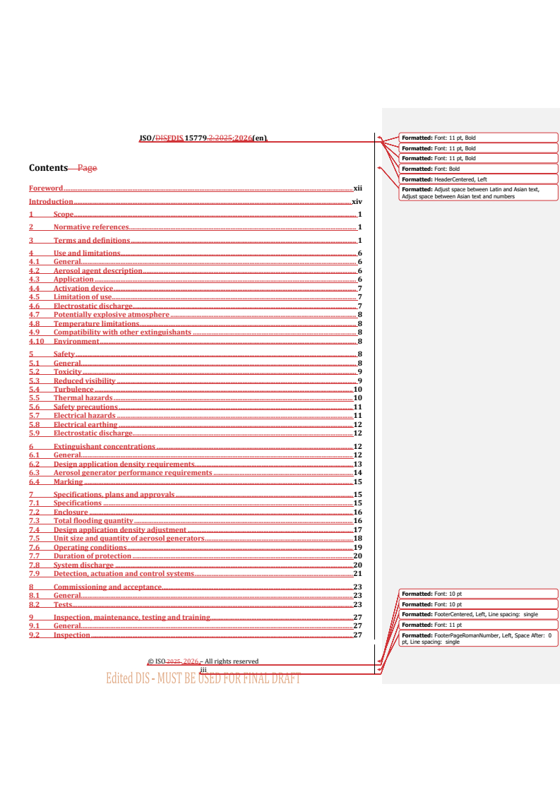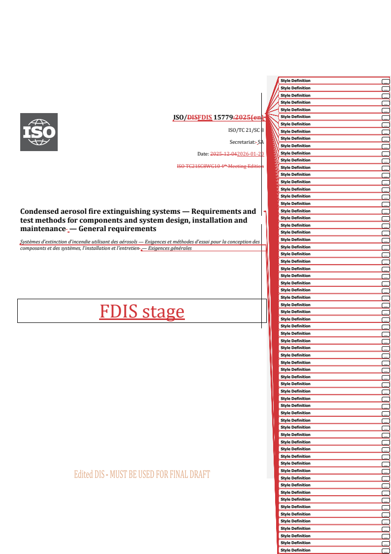 REDLINE ISO/FDIS 15779 - Condensed aerosol fire extinguishing systems — Requirements and test methods for components and system design, installation and maintenance — General requirements Released:21. 01. 2026