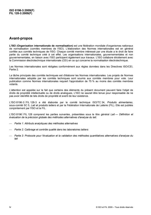 L'ISO 8196-3 | FIL 128-3:2009 spécifie un protocole pour l'évaluation et la validation des méthodes alternatives quantitatives d'analyse du lait. Le protocole est applicable à tous les constituants du lait, y compris les cellules somatiques. Pour les paramètres microbiologiques, d'autres normes, telles que l'ISO 16140, s'appliquent. L'ISO 8196-3 | FIL 128-3:2009 est également applicable à la validation de nouvelles méthodes alternatives pour lesquelles le nombre limité d'exécutants ne permet pas l'organisation d'une étude interlaboratoire et l'ISO 8196-1 | FIL 128-1 ne peut donc pas s'appliquer. L'ISO 8196-3 | FIL 128-3:2009 établit également les principes généraux d'une procédure de délivrance d'agréments internationaux de ces méthodes alternatives, basée sur le protocole de validation défini dans l'ISO 8196-3 | FIL 128-3:2009.