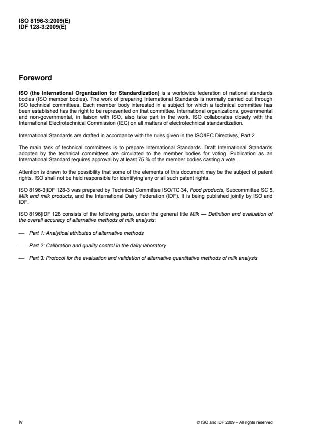 ISO 8196-3:2009 is a standard published by the International Organization for Standardization (ISO). Its full title is "Milk — Definition and evaluation of the overall accuracy of alternative methods of milk analysis — Part 3: Protocol for the evaluation and validation of alternative quantitative methods of milk analysis". This standard covers: ISO 8196-3¦IDF 128-3:2009 specifies a protocol for the evaluation and validation of alternative quantitative methods of milk analysis. The protocol is applicable to all milk components including somatic cells. For microbiological parameters other standards, such as ISO 16140, apply. ISO 8196-3¦IDF 128-3:2009 is also applicable to the validation of new alternative methods where a limited number of analysts does not allow the organization of an interlaboratory study and ISO 8196-1¦IDF 128-1, therefore, does not apply. ISO 8196-3¦IDF 128-3:2009 also establishes general principles of a procedure for granting international approvals of these alternative methods. These principles are based on the validation protocol defined in ISO 8196-3¦IDF 128-3:2009.