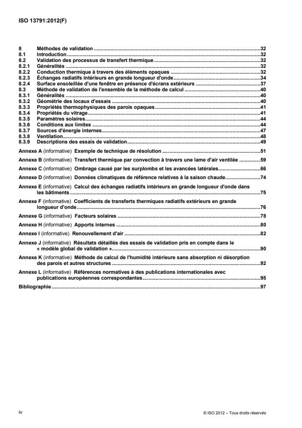 L'ISO 13791:2012 spécifie les hypothèses, conditions aux limites, équations et essais de validation à adopter pour une méthode de calcul, en régime transitoire horaire, des températures intérieures (de l'air et opérative) pendant les périodes chaudes, d'un seul local dépourvu d'installation de refroidissement/chauffage en service.
