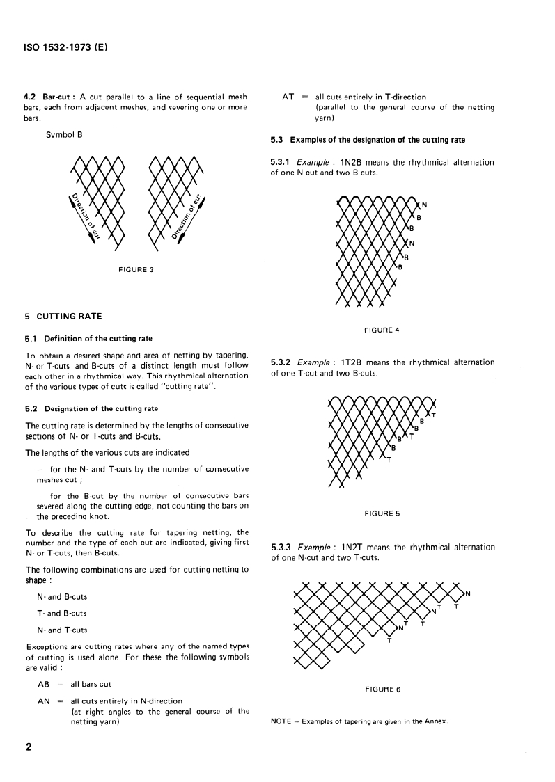 Depending on the desired final shape of netting, tapering cuts must be made in suitable ways. The various cutting rates are obtained by combining different lengths of cuts. Examples of tapering are given in the annex. - Replaces ISO Recommendation R 1532-1970.