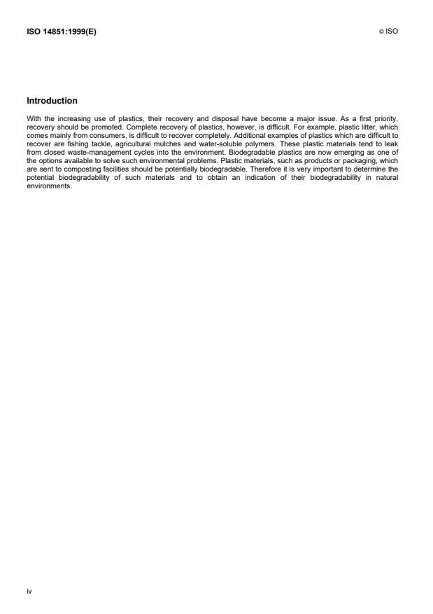 ISO 14851:1999 is a standard published by the International Organization for Standardization (ISO). Its full title is "Determination of the ultimate aerobic biodegradability of plastic materials in an aqueous medium — Method by measuring the oxygen demand in a closed respirometer". This standard covers: Determination of the ultimate aerobic biodegradability of plastic materials in an aqueous medium — Method by measuring the oxygen demand in a closed respirometer