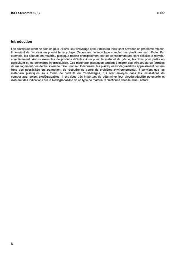 ISO 14851:1999 - Évaluation de la biodégradabilité aérobie ultime des matériaux plastiques en milieu aqueux -- Méthode par détermination de la demande en oxygene dans un respirometre fermé