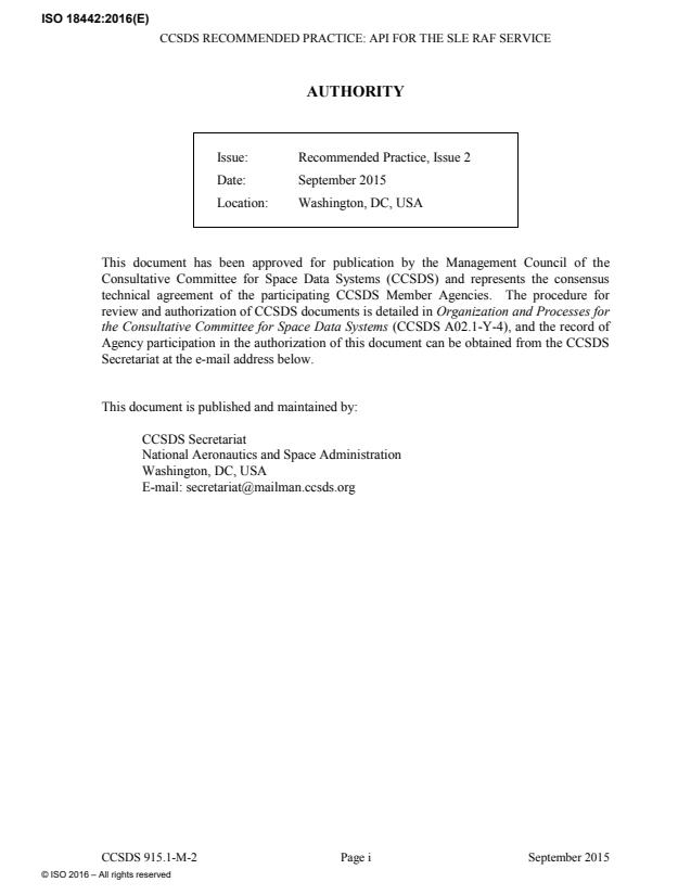 ISO 18442:2016 - "Space data and information transfer systems - Space link extension - Application program interface for return all frames service" - is an ISO adoption of a CCSDS Recommended Practice that specifies the SLE (Space Link Extension) API extensions required to support the Return All Frames (RAF) service. The standard defines the RAF‑specific functionality, interfaces, and externally visible behavior that SLE API implementations must provide in addition to the SLE API Core Specification. It does not specify internal component design, individual products, or the communication technology used.