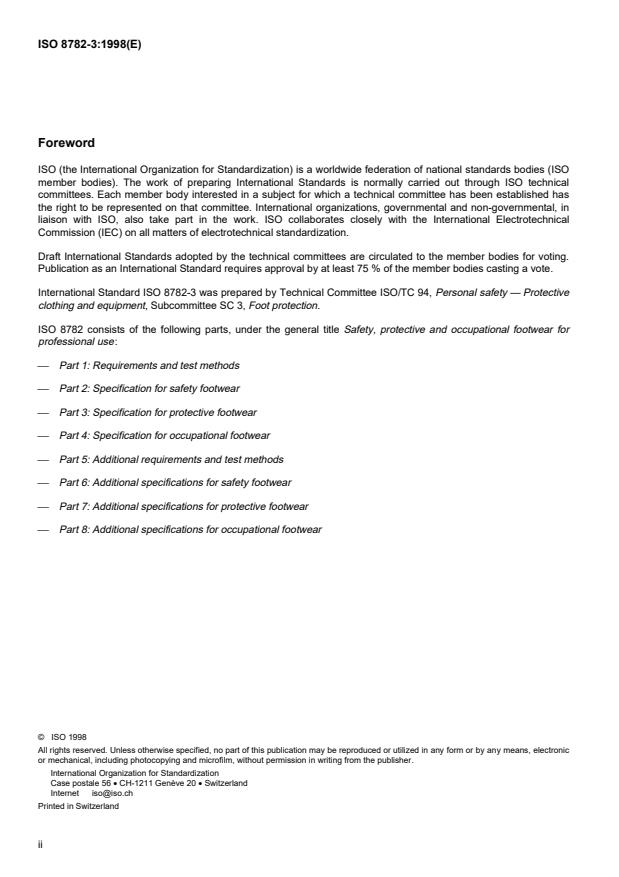 ISO 8782-3:1998 is a standard published by the International Organization for Standardization (ISO). Its full title is "Safety, protective and occupational footwear for professional use — Part 3: Specification for protective footwear". This standard covers: Safety, protective and occupational footwear for professional use — Part 3: Specification for protective footwear