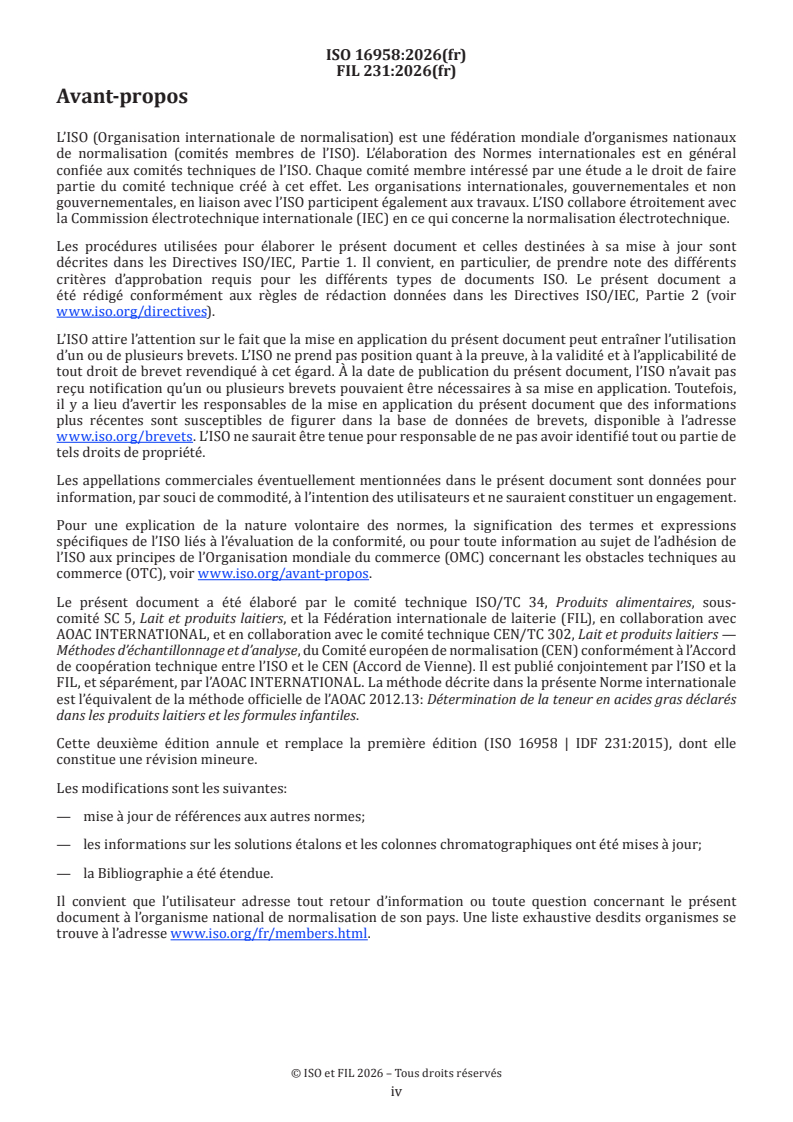 ISO 16958:2026 is a standard published by the International Organization for Standardization (ISO). Its full title is "Milk, milk products, infant formula and adult nutritionals — Determination of fatty acids composition — Capillary gas chromatographic method". This standard covers: This document specifies a method for the quantification of individual and/or all fatty acids content in the profile of milk, milk products, infant formula and adult nutritional formula, containing milk fat and/or vegetable oils, supplemented or not supplemented with oils rich in long chain polyunsaturated fatty acids (LC-PUFA). This also includes groups of fatty acids often labelled [i.e. trans fatty acids (TFA), saturated fatty acids (SFA), monounsaturated fatty acids (MUFA), polyunsaturated fatty acids (PUFA), omega-3, omega-6 and omega-9 fatty acids] and/or individual fatty acids [i.e. linoleic acid (LA), α-linolenic acid (ALA), arachidonic acid (ARA), eicosapentaenoic acid (EPA) and docosahexaenoic acid (DHA)]. The determination is performed by direct transesterification in food matrices, without prior fat extraction, and consequently it is applicable to liquid samples or reconstituted powder samples with water having total fat ≥ 1,5 % (mass fraction). The fat extracted from products containing less than 1,5 % (mass fraction) fat can be analysed with the same method after a preliminary fat extraction using methods referenced in Clause 2. Dairy products, such as soft or hard cheeses with acidity level ≤ 1 mmol/100 g of fat, can be analysed after a preliminary fat extraction using methods referenced in Clause 2. For products supplemented or enriched with PUFA with fish oil or algae origins, the evaporation of solvents is performed at the lowest possible temperature (e.g. max. 40 °C) to recover these sensitive fatty acids.
