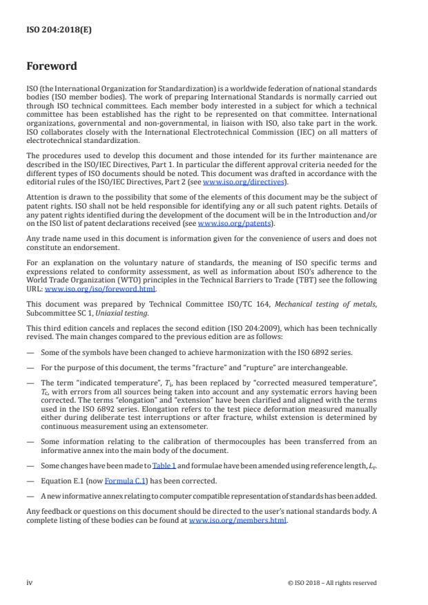 ISO 204:2018 is a standard published by the International Organization for Standardization (ISO). Its full title is "Metallic materials - Uniaxial creep testing in tension - Method of test". This standard covers: This document specifies the methods for a) uninterrupted creep tests with continuous monitoring of extension, b) interrupted creep tests with periodic measurement of elongation, c) stress rupture tests where normally only the time to fracture is measured, d) a test to verify that a predetermined time can be exceeded under a given force, with the elongation or extension not necessarily being reported. NOTE A creep test can be continued until fracture has occurred or it can be stopped before fracture.