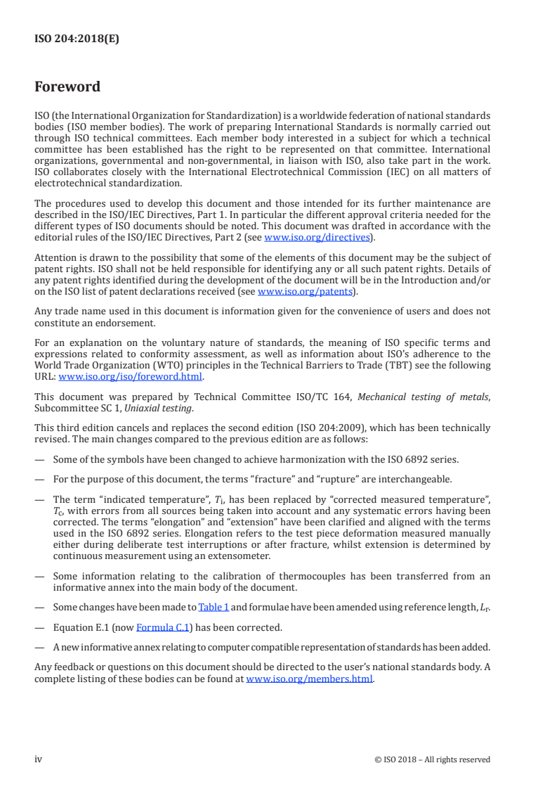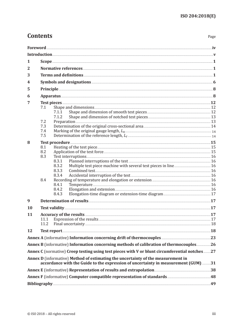 ISO 204:2018 is a standard published by the International Organization for Standardization (ISO). Its full title is "Metallic materials — Uniaxial creep testing in tension — Method of test". This standard covers: This document specifies the methods for a) uninterrupted creep tests with continuous monitoring of extension, b) interrupted creep tests with periodic measurement of elongation, c) stress rupture tests where normally only the time to fracture is measured, d) a test to verify that a predetermined time can be exceeded under a given force, with the elongation or extension not necessarily being reported. NOTE A creep test can be continued until fracture has occurred or it can be stopped before fracture.