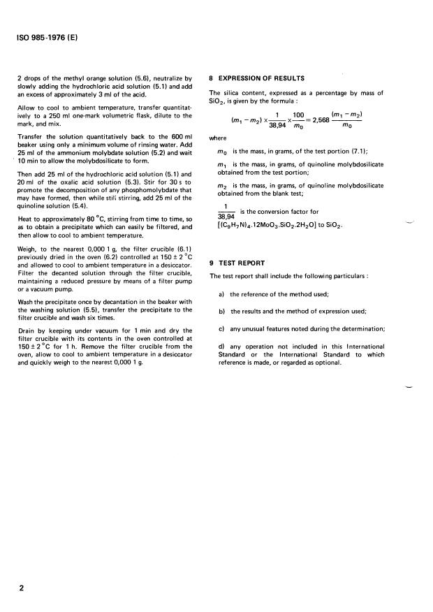 ISO 985:1976 is a standard published by the International Organization for Standardization (ISO). Its full title is "Sodium hydroxide for industrial use — Determination of silica content — Gravimetric method by precipitation of quinoline molybdosilicate". This standard covers: Sodium hydroxide for industrial use — Determination of silica content — Gravimetric method by precipitation of quinoline molybdosilicate