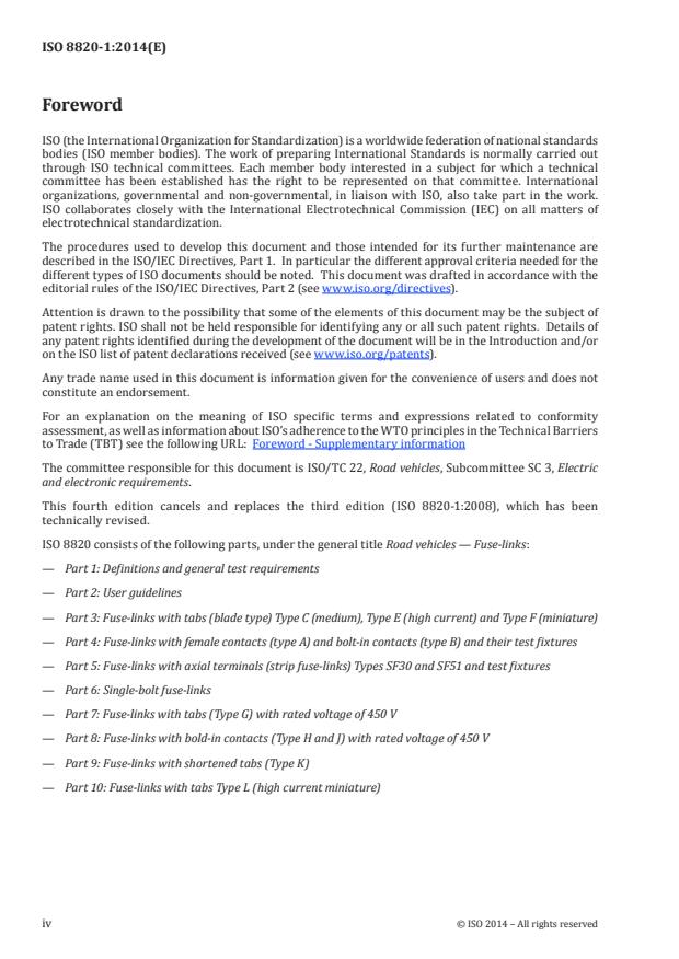 ISO 8820-1:2014 is a standard published by the International Organization for Standardization (ISO). Its full title is "Road vehicles - Fuse-links - Part 1: Definitions and general test requirements". This standard covers: ISO 8820-1:2014 defines terms and specifies general test requirements for fuse-links for electrical DC systems of road vehicles. This part of ISO 8820 is intended to be used in conjunction with other parts of ISO 8820, to which its requirements are applicable except where modified by the particular requirements of another part. This part of ISO 8820 is not applicable to fuse holders used in the vehicles.