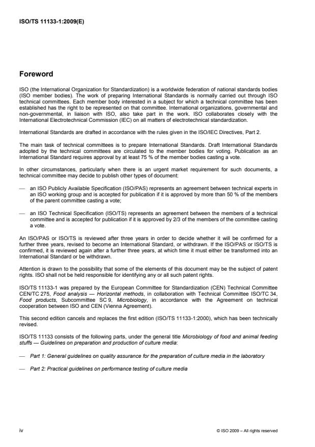 ISO/TS 11133-1:2009 is a technical specification published by the International Organization for Standardization (ISO). Its full title is "Microbiology of food and animal feeding stuffs — Guidelines on preparation and production of culture media — Part 1: General guidelines on quality assurance for the preparation of culture media in the laboratory". This standard covers: ISO/TS 11133-1:2009 provides the general terminology related to quality assurance and specifies the minimum requirements for the preparation of culture media to be used for the microbiological analysis of products intended for human consumption or animal feeding. It is also applicable to culture media to be used for the microbiological analysis of all kinds of water. These requirements are applicable to four categories of culture media used in laboratories that prepare and/or use culture media for performing microbiological analyses: commercially manufactured ready-to-use media; media to be remelted, supplemented and distributed; media prepared from commercially available dehydrated formulations; and media prepared from their individual components.