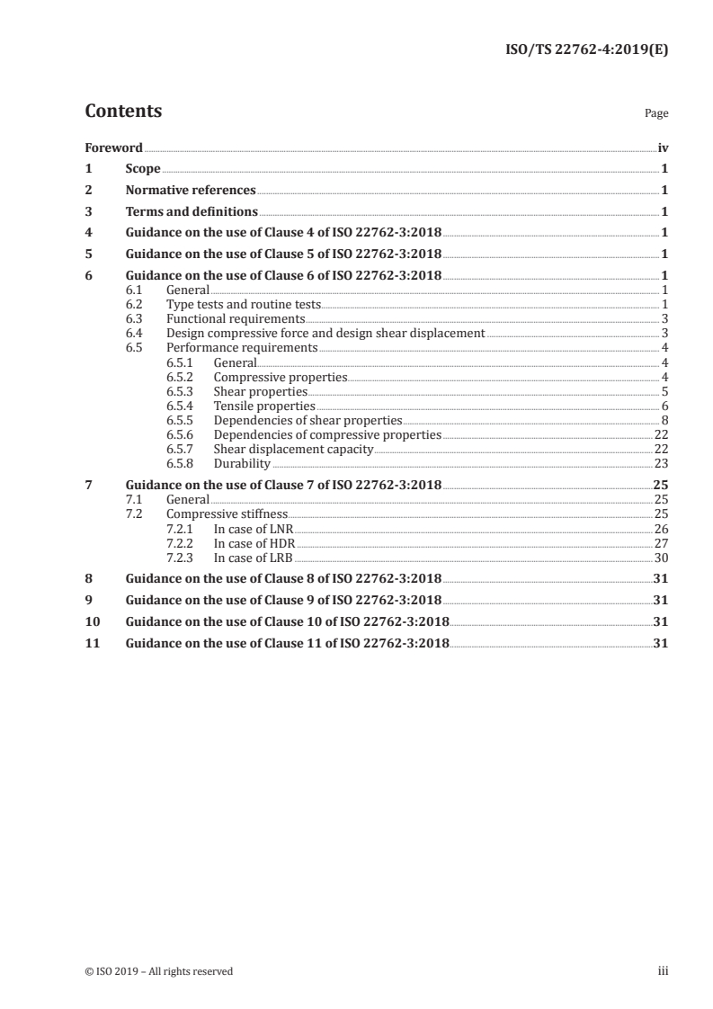 ISO/TS 22762-4:2019 is a technical specification published by the International Organization for Standardization (ISO). Its full title is "Elastomeric seismic-protection isolators — Part 4: Guidance on the application of ISO 22762-3". This standard covers: This document provides guidance on ISO 22762-3:2018. It includes examples of design calculations, and provides data on the characteristics obtained from all types of elastomeric isolators.