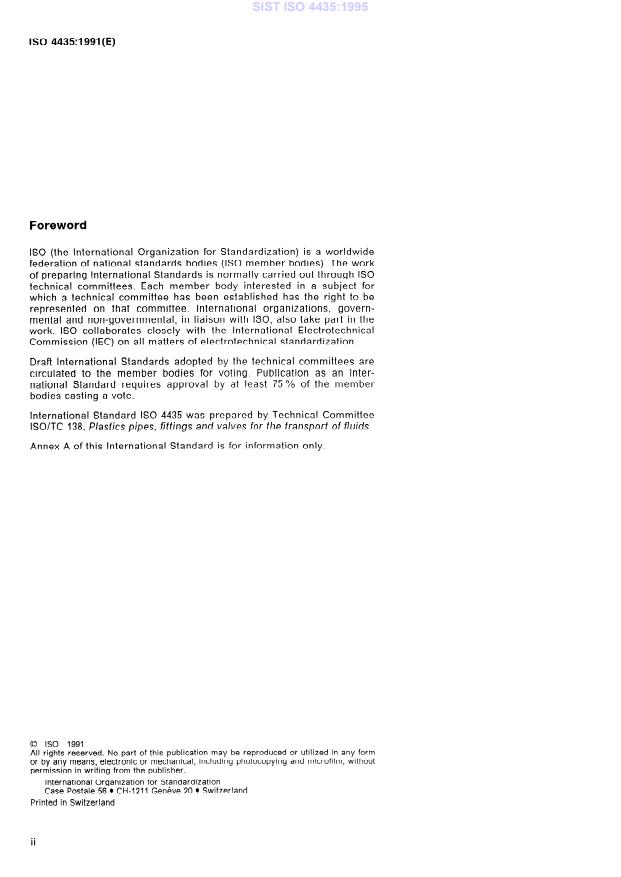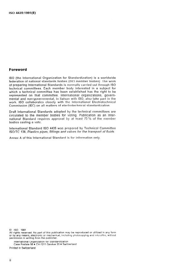 ISO 4435:1991 is a standard published by the International Organization for Standardization (ISO). Its full title is "Unplasticized poly(vinyl chloride) (PVC-U) pipes and fittings for buried drainage and sewerage systems — Specifications". This standard covers: Unplasticized poly(vinyl chloride) (PVC-U) pipes and fittings for buried drainage and sewerage systems — Specifications