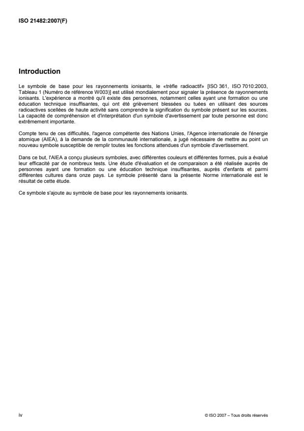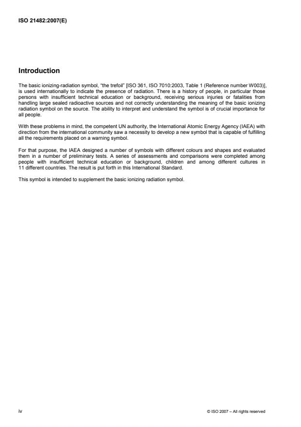 ISO 21482:2007 - Ionizing‑radiation warning: Supplementary symbol specifies a supplementary warning symbol to indicate the presence of a dangerous level of ionizing radiation from high‑level sealed radioactive sources. It does not replace the basic ionizing‑radiation trefoil (ISO 361 / ISO 7010) but supplements it by conveying the specific, life‑threatening hazard associated with IAEA Category 1, 2 and 3 sealed sources. The symbol was developed and tested internationally (including cross‑cultural and youth testing) to improve comprehension among untrained or uninformed members of the public.