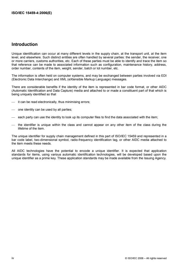 ISO/IEC 15459-4:2006 is a standard published by the International Organization for Standardization (ISO). Its full title is "Information technology — Unique identifiers — Part 4: Unique identifiers for supply chain management". This standard covers: Unique identification can occur at many different levels in the supply chain, at the transport unit, at the item level, and elsewhere. Such distinct entities are often handled by several parties: the sender, the receiver, one or more carriers, customs authorities, etc. Each of these parties must be able to identify and trace the item so that reference can be made to associated information such as configuration, maintenance history, address, order number, contents of the item, weight, sender, batch or lot number, etc. The information is often held on computer systems, and may be exchanged between parties involved via EDI (Electronic Data Interchange) and XML (eXtensible Markup Language) messages. There are considerable benefits if the identity of the item is represented in bar code format, or other AIDC (Automatic Identification and Data Capture) media and attached to or made a constituent part of that which is being uniquely identified so that it can be read electronically, thus minimising errors; one identity can be used by all parties; each party can use the identity to look up its computer files to find the data associated with the item; the identifier is unique within the class and cannot appear on any other item of the class during the lifetime of the item. The unique identifier for supply chain management defined in ISO/IEC 15459-4:2006 and represented in a bar code label, two-dimensional symbol, radio-frequency identification tag, or other AIDC media attached to the item meets these needs. All AIDC technologies have the potential to encode a unique identifier. It is expected that application standards for items, using various automatic identification technologies, will be developed based upon the unique identifier as a prime key. These application standards may be made available from the Issuing Agency. ISO/IEC 15459-4:2006 specifies a unique, non-significant string of characters for the unique identifier for supply chain management. The character string is intended to be represented in a bar code label or other AIDC media attached to the item to meet supply chain management needs. To address management needs different classes of items are recognized in the various parts of ISO/IEC 15459, which allows different requirements to be met by the unique identifiers associated with each class. The rules are defined for the unique identifiers for supply chain management to identify the unique occurrence of an item, understood to mean the layers zero and one as will be defined in two future International Standards (ISO 17367 and ISO 17366, respectively).