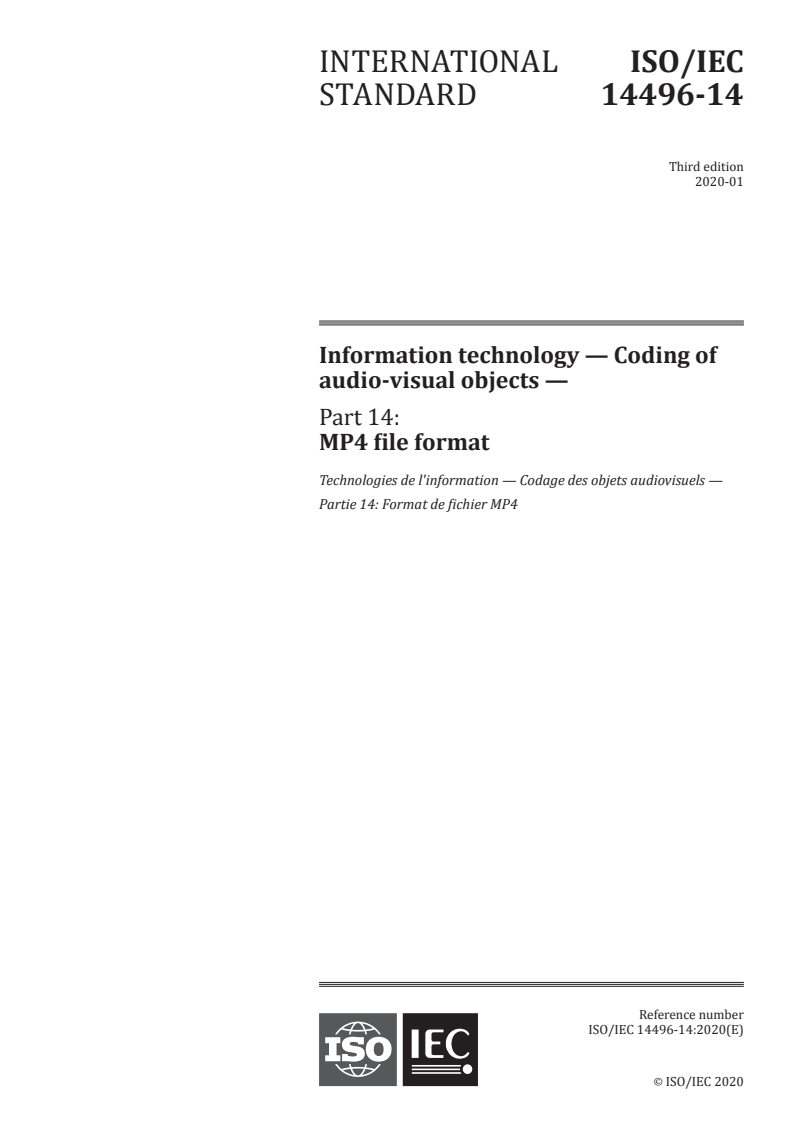 ISO/IEC 14496-14:2020 - Information technology — Coding of audio-visual objects — Part 14: MP4 file format Released:1/27/2020