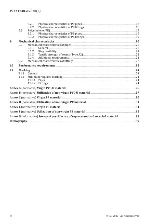 - Materials: Requirements for PVC‑U, PP and PE pipe and fitting materials, including provisions on the use of virgin and non‑virgin (reprocessed/recycled) materials (normative annexes).