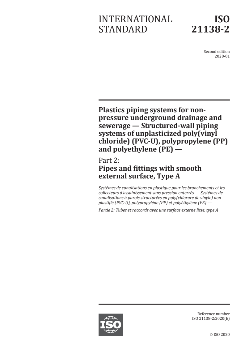 Keywords: ISO 21138‑2:2020, structured‑wall piping systems, Type A, PVC‑U, PP, PE, non‑pressure underground drainage, sewerage, smooth external surface, ring stiffness, joints, test methods.