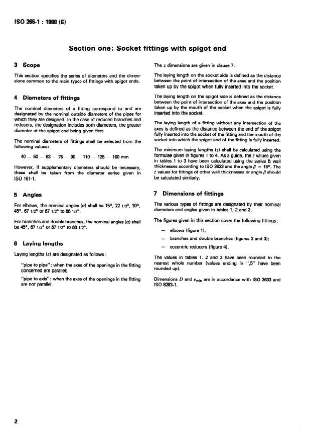 Keywords: ISO 265-1, PVC‑U fittings, metric series, waste pipes, spigot ends, socket fittings, curved entry, laying length, elbows, reducers, branches.