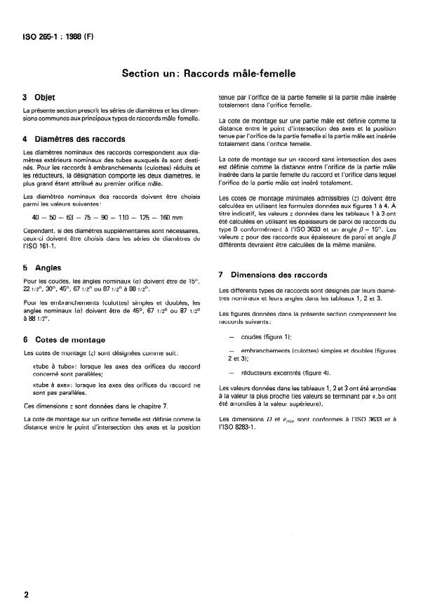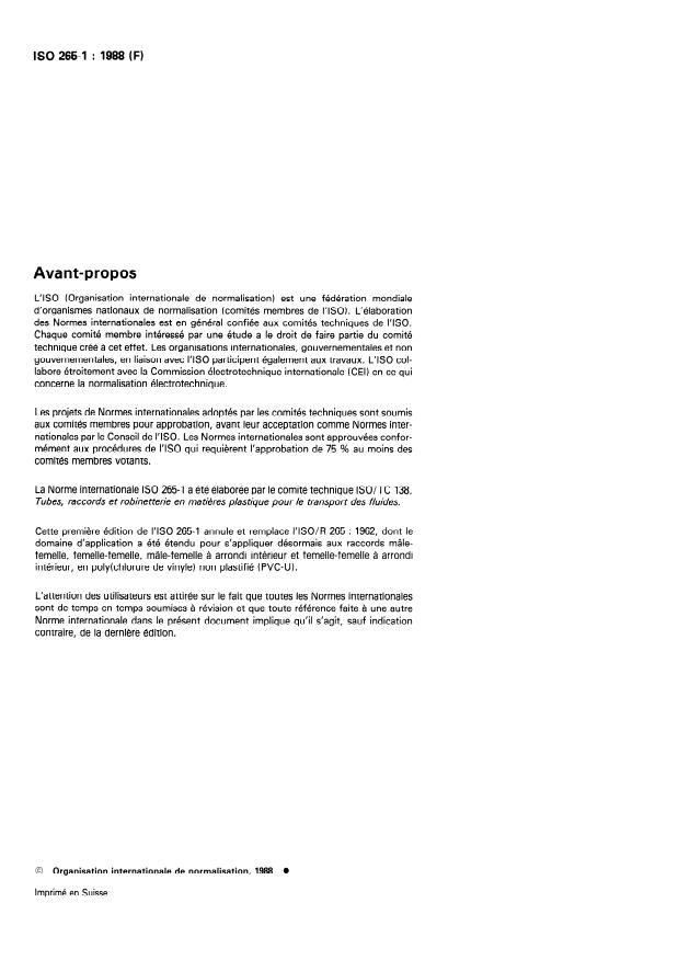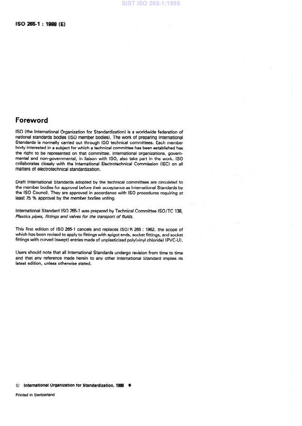 ISO 265-1:1988 is a standard published by the International Organization for Standardization (ISO). Its full title is "Pipes and fittings of plastics materials - Fittings for domestic and industrial waste pipes - Basic dimensions: Metric series - Part 1: Unplasticized poly(vinyl chloride) (PVC-U)". This standard covers: Specifies the series of diameters and the formulae for calculation of the dimensions common to the main types of fittings with spigot ends (socket fittings with curved entries and branches) made of PVC-U.