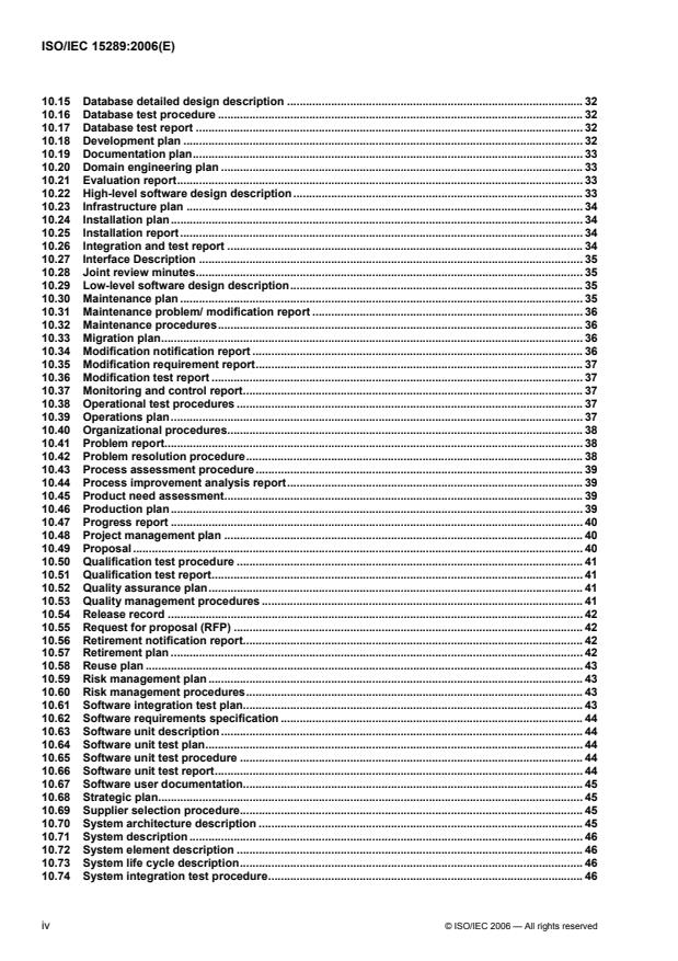 ISO/IEC 15289:2006 was developed to assist users of systems and software life cycle processes to manage information items (documents). It is based on the life cycle processes specified in ISO/IEC 15288 or ISO/IEC 12207:1995/AMD 1:2002/AMD 2. Information items are essential to preserving what transpired when using system life cycle processes, and may be identified as deliverable documents. ISO/IEC 15289:2006 identifies the purpose and content of all identified systems and software life cycle information items as required for the various life cycle processes. The information item contents are defined according to generic document types (which may be referred to as information item types) and the specific purpose of the document. ISO/IEC 15289:2006 may be applied to any of the activities and tasks of a project, system or software product, or service life cycle. It is not limited by the size, complexity or criticality of the project. It may be applied to all forms of information items, information item content, and document delivery media. Information items may be combined or subdivided as needed for project or organizational purposes. The nomenclature for information items, document titles and contents is informative.