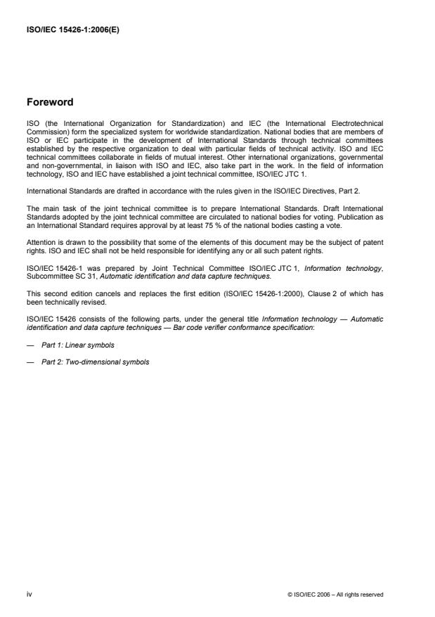 ISO/IEC 15426-1:2006 is a standard published by the International Organization for Standardization (ISO). Its full title is "Information technology - Automatic identification and data capture techniques - Bar code verifier conformance specification - Part 1: Linear symbols". This standard covers: The technology of bar coding is based on the recognition of patterns encoded in dark and light elements of defined dimensions according to rules defining the translation of characters into such patterns, known as the symbology specification. The bar code symbol, as a machine-readable data carrier, must be produced in such a way as to be reliably decoded at the point of use, if it is to fulfil its basic objective. Standard methodologies have been developed for measuring and assessing the quality of symbols for process control and quality assurance purposes during symbol production as well as afterwards. Manufacturers of bar code equipment, the producers of bar code symbols and the users of bar code technology require publicly available standard conformance specifications for measuring equipment applying this methodology, to ensure the accuracy and consistency of performance of this equipment. ISO/IEC 15426-1:2006 defines test methods and minimum accuracy criteria for verifiers using the methodology of ISO/IEC 15416 for linear bar code symbols, and specifies reference calibration standards against which these should be tested. ISO/IEC 15426-1:2006 provides for testing of representative samples of the equipment.